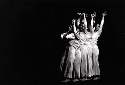 Spanish Dance begins with five women equally spaced across the front of a proscenium or gallery, stretching from one wall to another. They wear what Wendy Perron, now editor-in-chief of Dance Magazine and a former Brown dancer, termed “arte povera” whites – drawstring pants and long sleeved T-shirts- once cheap, now chic. As Bob Dylan’s rendition of Early Mornin’ Rain plays, the woman furthest to the audience’s right steps in time, gradually unfurling her arms, flamenco style. She paces forward, bumping the knees of the woman in front of her who, in turn, unfurls her arms, and so on, until the pile-up of all the women, hips pressed together and swaying in a sensual unison, is arrested at the very last note of the music by the boundary of the wall. They are squished, just as the song intones “with nowhere to go.”