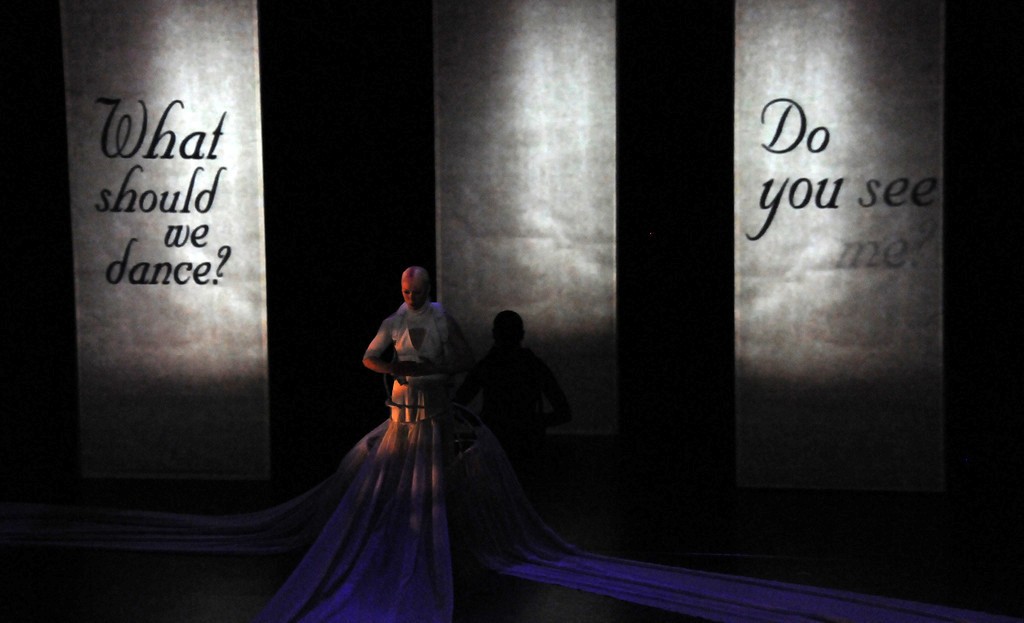 After a brief introduction to David Browning’s Lincoln character in the Painted Bride’s café, we follow him into the theatre to find the stage masked with fog and enveloped by Lindsay Browning and her costume, which includes three white panels that extend to the edges of the stage. Another three white panels hang behind her.