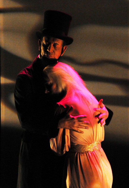 Later, Lindsay Browning and John Luna execute a meticulous dance with pocket watches, spinning them in circles with graceful halts or like nunchaku. Then in a gorgeous but perplexing set of video projections, we see child Lincoln (Tommy Burkel) and young adult Lincoln (Luna) in a series of scenes walking off in silence and bright light, taking hats on and off, removing and dropping notes. Again, these seem symbolic, but as they’re not picked up elsewhere in the piece, it’s hard to discern where they might point.