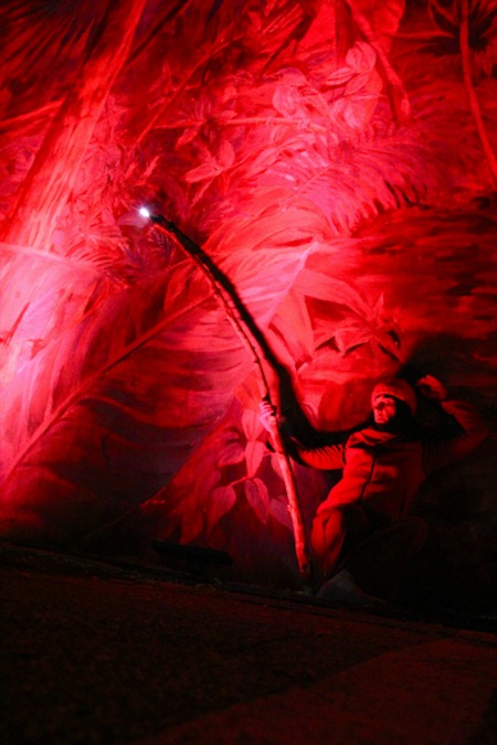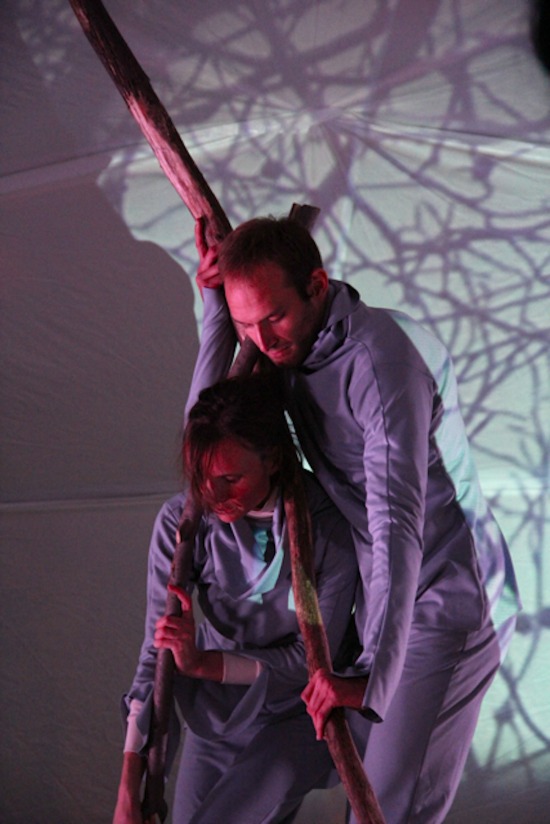 So I am breathing and slowing down in my grey, cowled costume that makes me feel like a stylish monk. I creep forward, my toes cold but I won’t register that until after this final performance of SoMoS. I sink into the branch, playing with the pressure I apply, at times hanging fully from it, feeling it rooted into the earth, at others lightly sliding my fingers over the ridges and grooves, the remnants of bark. I feel the projections on my face, Lauren Mandilian’s layering of images: frozen parks spaces, barren trees, melting ice, metallic grey skies. I move my hand in the projectors' light, knowing that my shadow is magnified on the back wall of the white tent, the 30x30 yurt-style tent that Merián deemed “winter.” I know that there are three other tents, three other fantastic, lit snow globes with branch dancing bodies swirling in and around them, and my awareness tugs to that macro-level understanding of SoMoS, so I actively re-connect to the micro, to the moment, to my branch, to the three other bodies sharing my “winter” landscape, to the audience members sitting a few feet away from me on the sides of the tent. I breathe and slow down and hope that everything around me follows, my awareness creating a ripple of charged energy moving outwards. - Beau Hancock