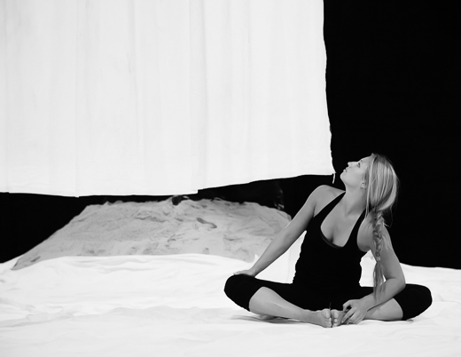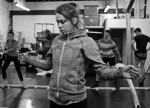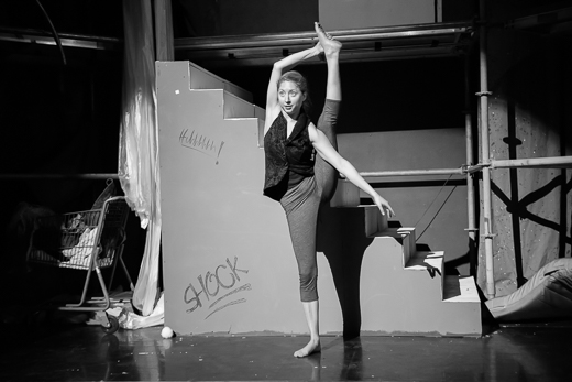 Dancer Christine Morano stretches while waiting on set during rehearsal of Snowball