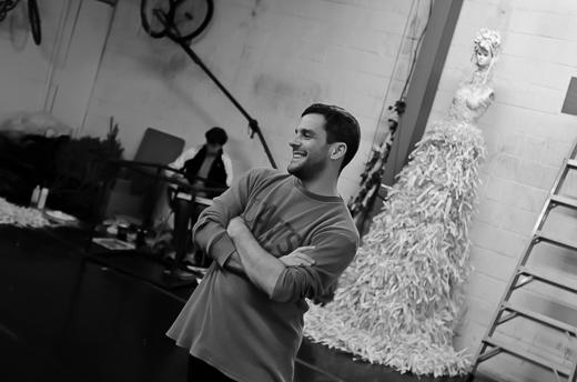 Brian Sanders in his practice space in Philadelphia in January 2012; the company has since moved to a converted church. Behind him is a decorated mannequin, a prop at the January 2012 Snowball fundraiser.