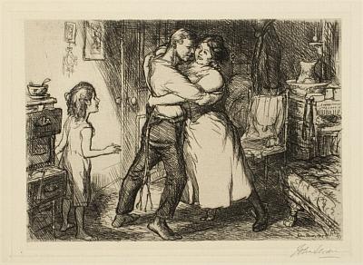 What follows the consummation? A home, a life, love, and progeny. John Sloan’s 1905 etching, Man, Wife, and Child, brings us into that home as seen by the artist through a window from his own residence: a man and woman—his suspenders dropping off his shoulders, her chest pressed to his—dance with abandon as a delighted ragamuffin looks on, while a bed is visible in the back room where, perhaps, this child was conceived. We know where dancing leads, after all. This image, too, has its dark undertones; its passionate drive toward life, despite the straitened circumstances of the family depicted, is exciting, but so risqué for its time that it was rejected from an exhibition for fear of its vulgarity. Yes, they too knew where dancing leads.
