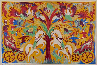 ballet Les Noces (The Wedding) proved as ill-fated as, I expect, was the marriage the ballet depicts. In the ballet, Nijinska’s movement and Stravinsky’s music depict the grimmest, least joyful wedding imaginable: no smiles grace the faces of any relatives or friends, let alone the doomed-looking bride and groom; the angular, symmetrical dance and music patterns create walls closing in on the nuptial couple, and the color scheme of the costumes and set is dominated by brown and black. Apparently unaware of this conception, Goncharova initially designed a stage curtain of brilliant hues, dominated by orange, pink, and red, with splashes of green, blue, earthy brown, and white. Its imagery, beautifully depicted in opaque watercolor, is of florescence: a tree sprouting leaves, flowers, angels, and doves surrounded by wheeled carriages and lively peasant figures. Not surprisingly, Goncharova’s celebratory curtain design was later scrapped for a plain brown swath. The long-gestating ballet premiered in 1923.