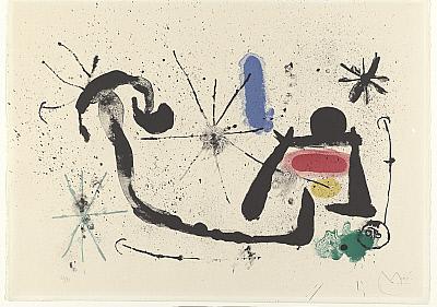 Once a couple is wed, the marriage must be consummated. This we see in Joan Miró’s Danse Nuptiale (Wedding Dance). The abstract color lithograph of this surrealist features a long, variously thick and angled black line reaching across a white space marked by stars (or are they spiders?), to pierce the deep-red core of an embracing three-sided square topped by a black blob. Nature, heaven and earth meet in this dance of snaky, fiery union.
