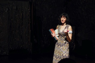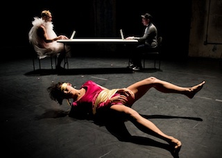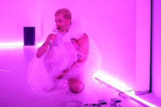 Just days later, on the day of the terrorist attacks in Paris, Miguel began by asking the audience for a brief moment of silence in solidarity. Michelle Boulé, “the muse,” entered, dressed in all pink, with a rope light of the same color fastened around her body. She sang, her silhouette reminding me of a pink gingerbread cookie. A projection explained who the people on stage were: Ben Pryor (Miguel’s manager); Jaime Maseda (playing Miguel, dressed in Miguel’s costume from Part 1); Michelle Boulé (his muse); and lighting designer Lenore Doxsee (not present). Sitting at a table for most of the show, Jaime/Miguel and Ben reenacted real conversations, while the “Asian Beauty” (Michelle Boulé) poured herself all around the stage, ignored by the others. The real Miguel, also a witness on stage, brought a sense of duplicity. Who is the artist and who is the person? Are they different?