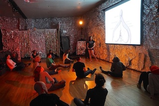 The very next day, I was confronted by provocations, irony, humor, bickering, anger, feminism, loneliness, information about the clitoris, nudity, sensuality, a talking belly button, and more at Gabi and Nicole’s show. A trailer for their short film Chicken Fight (which also had its own Kickstarter campaign, goal: $1,000, 000) started the evening. Fast frames shifted between slapstick comedy, intimate girltalk, fighting and talking fist puppets. Sometimes funny and mostly confusing, what I got was that Gabi and Nicole fight—because they are friends who disagree and also because they made less money than any of the other people who worked on this project.