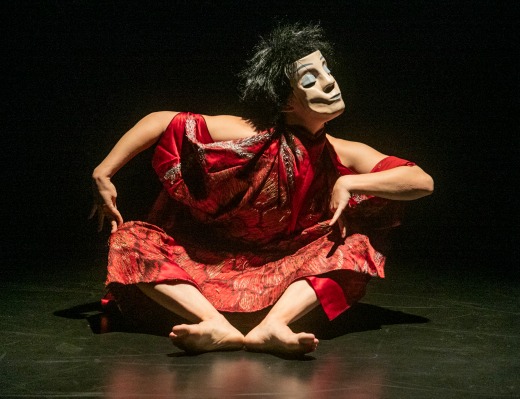 To see a restaging of a work like Mary Wigman’s Hexentanz provides a jolting reminder of the power and intensity of early modern dance. This 1926 solo by the German pioneer can be seen in a flickering two minute black and white YouTube clip. But to see it full length, in living color (with red costume!) danced convincingly by Jennifer Yackel is a rare thrill. The seated opening makes high drama of sideways shifts, with Yackel’s clawing hands and jutting elbows accompanied by simultaneous cymbal crashes. Her masked visage and black wig turn her into the ur-sorceress, stomping and thrashing before settling back in her starting place.