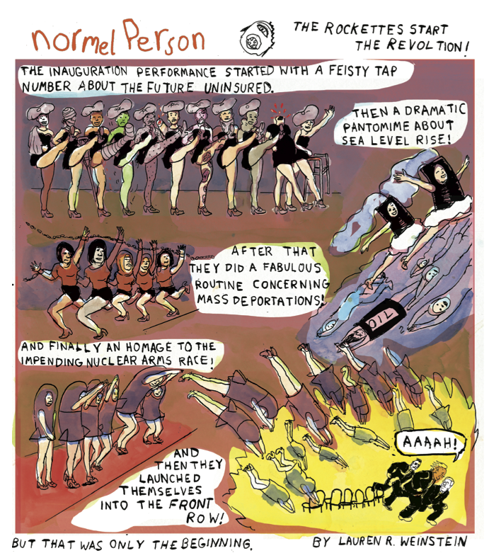 I am grateful to the Village Voice and artist Lauren R. Weinstein for allowing me to reprint her grim satire The Rockettes Start the Revolution!