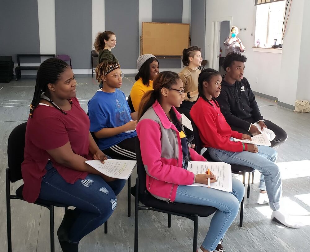 It’s late July and we find ourselves again in borrowed spaces to begin rehearsals and journey into the next phase of creation. Weinraub helps us to get grounded as we practice movement embodying our school experiences. We play in the world of imagination, hearing school bells, passing through metal detectors, meeting friends and teachers in the school halls. We laugh at the humorous moments of ridiculous paperwork and protocols and grow somber in moments that highlight institutional racism and carceral discipline deeply embedded in the educational system. Chairs, tables, and bookbags become temporary props as we test out different scene ideas. We take frequent breaks to nourish bodies and souls through food and conversation. The gift of time and space allows us the opportunity to process what we feel, unlike in school, where we barely scratch the surface of issues. And by facing these problems through art, we practice self-empowerment. Students candidly tell teachers they saw them as the enemy until hearing their stories. Teachers admit how they let frustrations with administration, the school board, and society-at-large affect their classrooms. We all let our guard down and realize it isn’t student-versus-teacher; we’re all just trying to survive multiple oppressive forces. We identify many examples as a group ranging from capitalism, white supremacy, patriarchy, violence, and beyond.