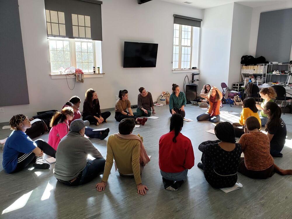 The project starts with Weinraub and TAG core members Alma Sheppard-Matsuo, Aileen Haggerty, and Maria Carambo gathering people in story circles, each having a particular theme and set of questions. They open by asking participants what drew them to share their stories. Teachers reflect on the question of why they became educators. They ponder their purpose, the things “that get in their way,” the mistakes they make. The student circles share stories of harm and care they have experienced. They also question how school is “missing the mark.” They problem-solve how school could be better. During Philly Education Stories, TAG convened over 100 students and educators over several months, all processing the complex emotions of their truths through theater-making exercises. For example, participants are asked to use movements and gestures that show what school feels like or to embody a topic discussed during the circle. There are moments of shared joy and pain centered on the commonality of these stories. There are many tears. Connections begin to emerge. A sense of shared community and safety begins to grow.