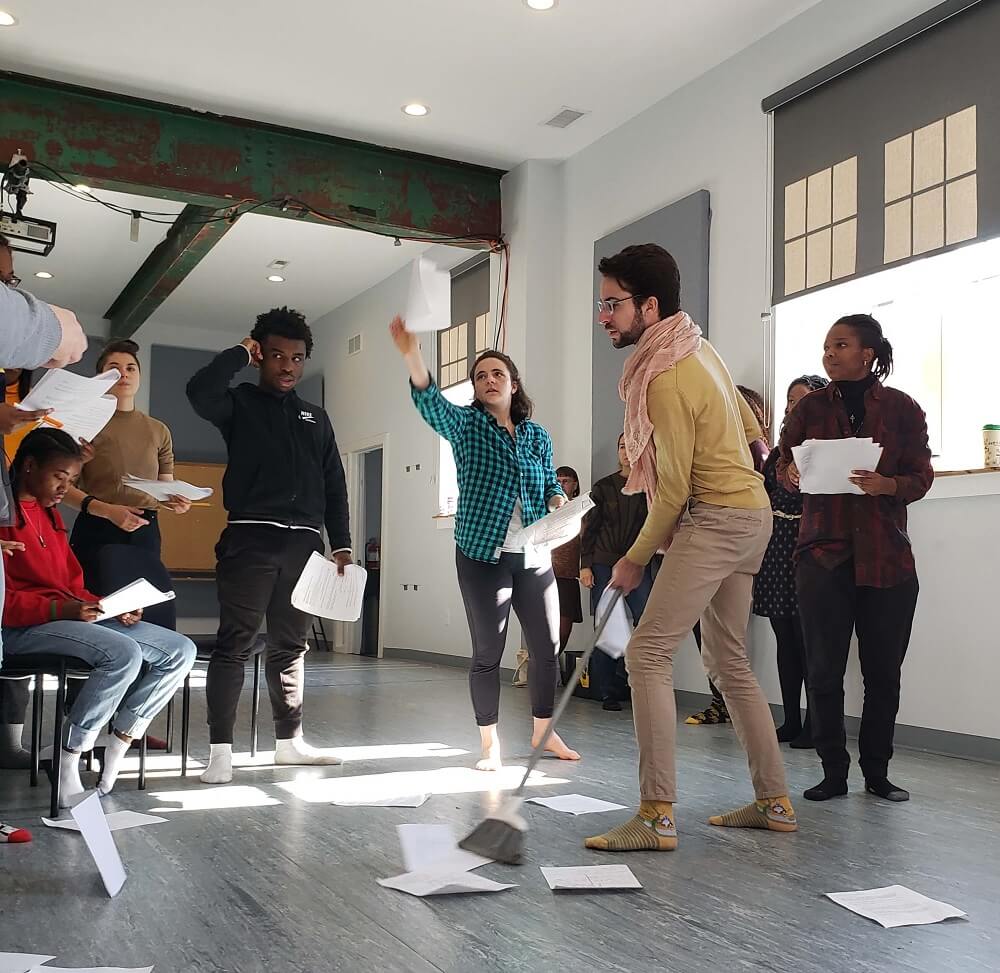 After the storytelling comes synthesis. Participants convene in row homes and meeting spaces around South Philly, listening to recordings from the story circles. Weinraub asks us to immerse our senses in these stories. The tension between the problems of the world and the everyday challenges in the classroom can be heard in the recordings: more questions than answers. We start imagining large panels floating around the stage, holding these looming questions. We see a broom sweeping problems under a metaphorical rug. We know we need a scene where a student has to go to the bathroom right when the teacher has settled down the classroom, and the teacher feels forced to neglect this need. Dozens of flip charts later, scripts, props, and musical numbers begin to take form. Sound designer Anthony Martinez-Briggs helps mold a dynamic auditory experience. We’re given breathing room and time off so we can further reflect on the ideas generated. Weinraub writes the first draft of synthesis and we move from the problem/research phase to the understanding/action phase.