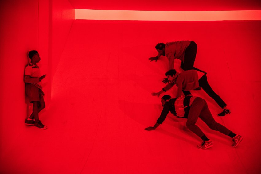 For example, in Kill Move Paradise, there was a steep slope, created by Matt Saunders, this huge white surface was very extreme and revealing, everything shown, nowhere to disguise. Actors’ entrances were often sudden and abrupt and I needed to choreograph sequences of movements to roll, slide, stand up effortlessly and securely as the slope was steep and risky. The actors needed to walk as if the tilted space was a “new normal” state of being; we worked on how to trace each part of the body to achieve a new alignment to regain the vertical pull in an unreasonable angled position, walking, sitting, running from that point of departure was very intense. Observing, experimenting, we adapted the bodies to the extreme space, and this influenced all aspects of the performance. It works both ways, the text and its meaning affected everything as well: space, bodies, actions, a new reality, a window into the world and state of being of the actors.