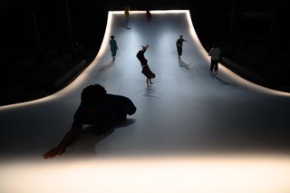 The text, space, and creative process were unforgiving; we spent hours adapting the body to move on the waved floor, and with cables everywhere, darkness, and blinding projections, this was a harsh environment for the actors to embody these questions. Yet these extreme conditions brought the most profound responses from all of us. I believe the work came out as an insightful meditation on life.
