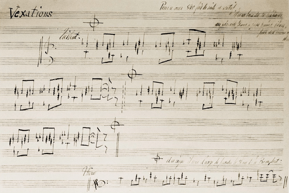 EL: So let's put John Cage and Erik Satie versus each other for the sake of this conversation. John Cage opened the structure, allowing access, saying everyone can do this. There was a level of absurdity, a level of mundane operations. And, of course, that level of chance. And those things all exist in the work of Satie. To perform his work, however, you need to be highly trained in reading musical scores and reading musical scores that are complicated and left open to complex interpretations. You have to be a master craftsman at this thing to ultimately understand what I think is his humor embedded in the score. Take Vexations, a joke played on this mastery and the masters, but it requires great skill to execute. And so these two bodies of work are pretty beautiful, contain absurdity, human interpretation, and a significant amount of artistry. It's just that they both understood where they wanted to lie with it.