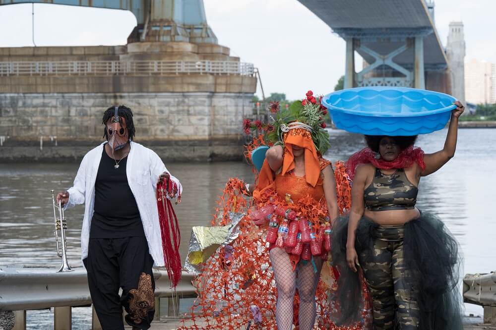 Before the singing processional, the artists of Propelled Animals stood at the bottom of a boat ramp to the Lenape Sippu/Delaware River, the audience on the adjacent sidewalk. The oranges, blues, and reds of their costumes and props stood out against the muted browns of the river behind them. Monroe held a sky blue, mini plastic swimming pool on her head. Baker-Tarpaga wore a dress of plastic bottles with an orange, plastic net draped over her.