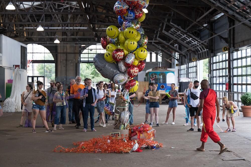 Once inside the pier, Baker-Tarpaga placed the plastic netting around a tower of mylar balloons with expressions for all occasions, like “Happy Birthday” and yellow smiley faces. I learned later from Baker-Tarpaga that this was created by Barber as a memorial. At first, I read the tower as a celebration. As the piece continued, and gun violence became a recurring theme, I saw the balloons instead as a community’s spontaneous response to victims of gun violence.