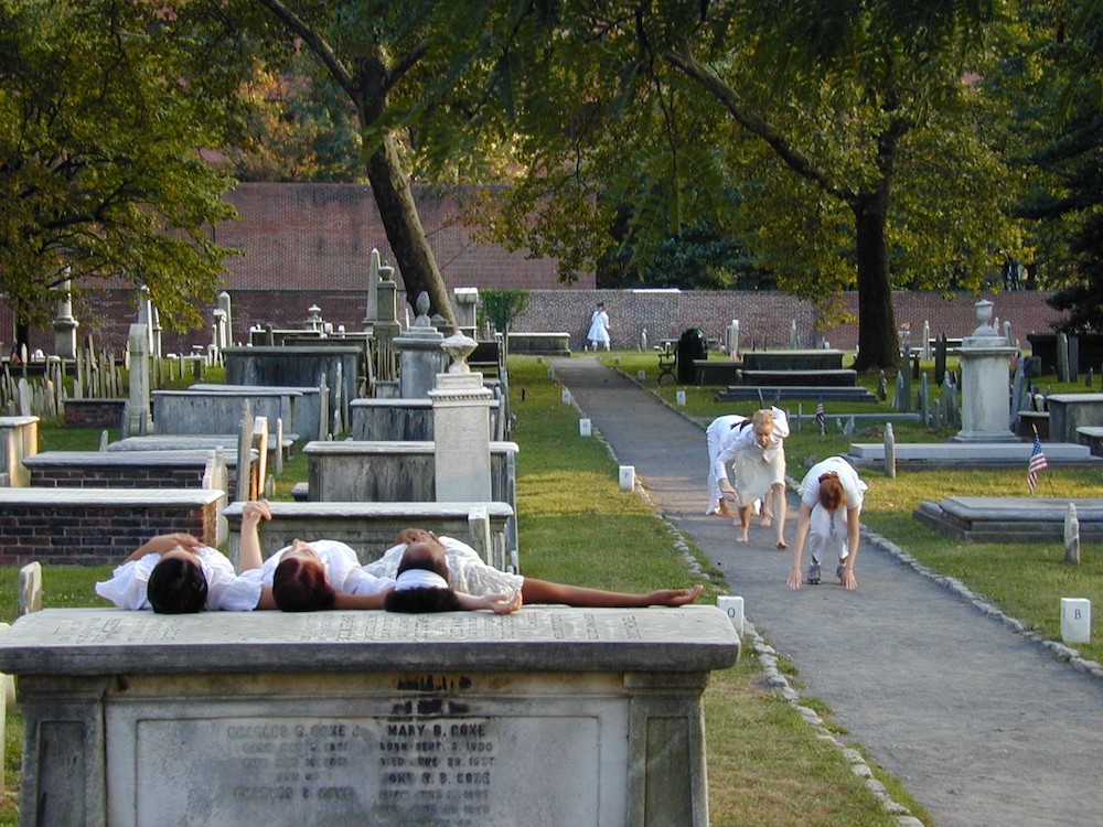 Corner Stone (2004), Christ Church Burial Ground, Philadelphia by Leah Stein, dancers: Michele Tantoco, Michelle Fenner, Tamara Xavier, Jenny Sawyer, Shavon Norris + 2 others, Photo: Leah Stein