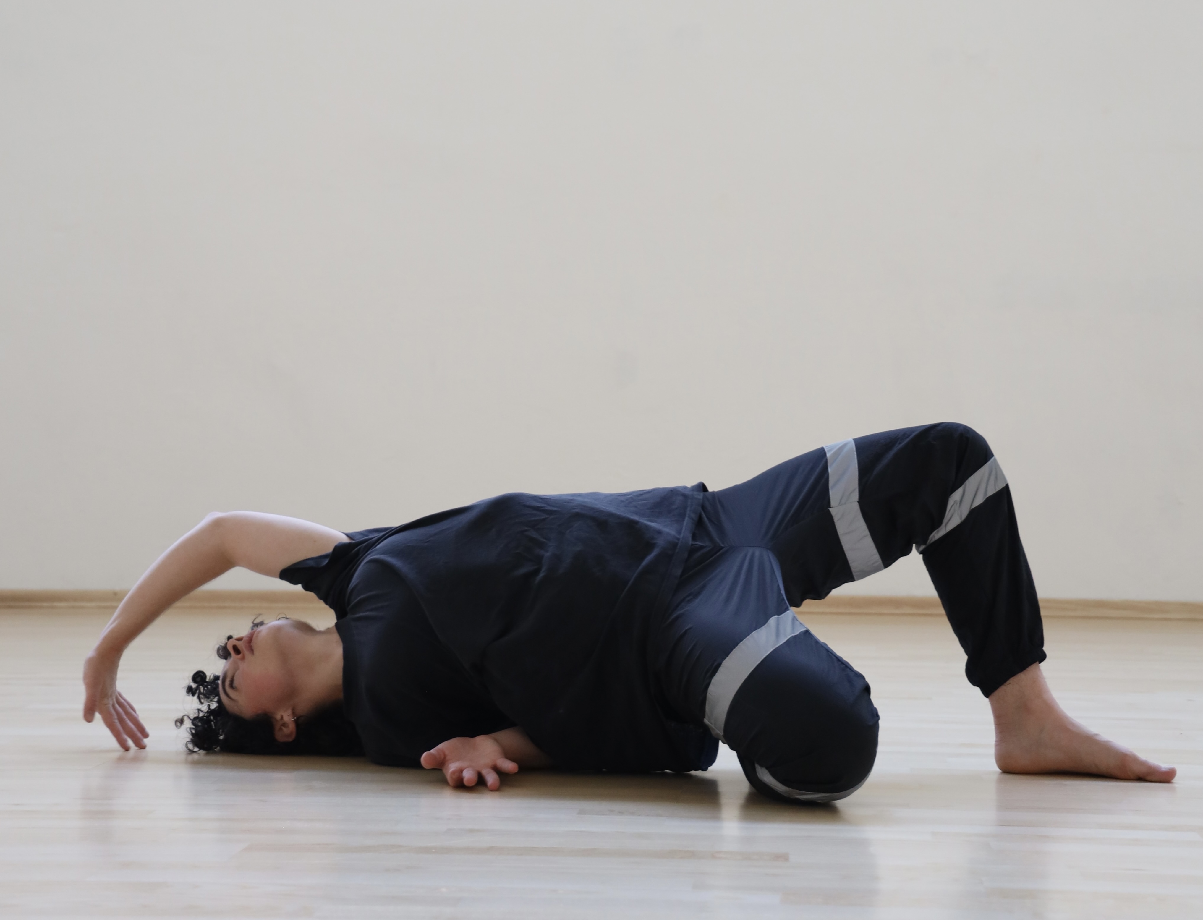 Minutes stretch. Stillness grows louder. When Kim finally tilts forward, the air shifts. She becomes more hurried, more frantic, more explosive. We see her face–but only in moments. It’s like watching someone argue with herself in slow motion: afraid to look, too curious not to. Her restraint is deliberate. Every micro-shift feels seismic. Kim is safe behind her hands, but only barely. She moves in bursts—extension, collapse, a sudden shift of weight—reaching toward something just out of reach, then pulling back into herself. Watching her is like watching the body wrestle with the soul’s impulse: to seek what we fear, to reveal, then retreat.