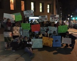 A woman shouts “Come dance Dabke for justice!” to protest the Kibbutz Contemporary Dance Company's Philadelphia appearance.